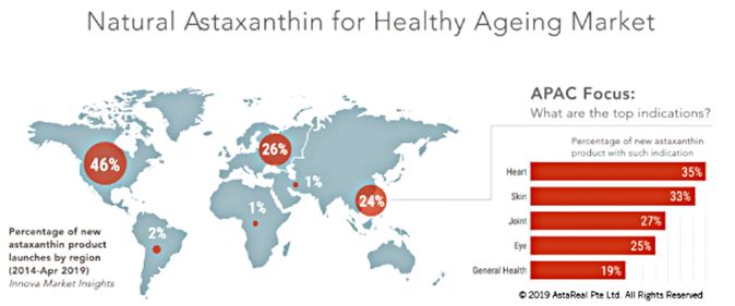 随着生活水平的不断完善,人们平均寿命和生活质量也在增加,随之而来的就是如何“健康变老”。瑞典AstaReal是目前全球较大的雨生红球藻虾青素生产基地和供应商之一,比较关注虾青素在抗衰老市场的应用。Innova Market Insights市场数据显示,2014-2019年4月,针对抗衰老市场,全球推出虾青素产品最多的区域是北美(46%),其次是欧洲(26%)、亚太(24%)、南美(2%)。对于亚太地区而言,关注的重点集中在心脏健康、皮肤健康、关节健康、眼部保护和整体健康。 全球天然虾青素抗衰市场 图片来源:AstaReal