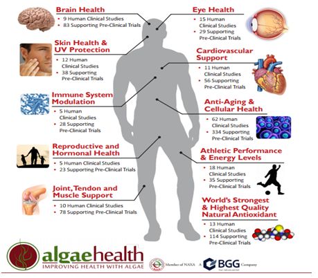 在天然虾青素健康研究方面,Algae Health开展了多项动物试验和人体研究。截止目前,该公司已经向美国FDA递交了241项AstaZineTM相关的健康声称,仅有2项受到否决,这些健康声称在美国市场上可用于产品标签信息或营销活动,包括维持关节健康、支持眼睛和脑部、有助于维持皮肤状态、增加免疫力、对抗自由基等。此外,该产品在2016年获得美国和爱尔兰新食品成分的认证,使用的剂量从12mg/d增加到24mg/d。