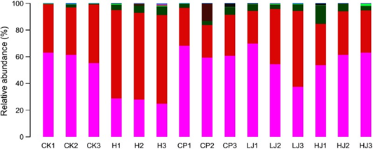 受治疗影响,小鼠肠道内容物中优势菌门的相对丰度。相对丰度基于可在门类级别分类的DNA序列的比例频率。CK,标准饮食+每天每人5 g / kg的生理盐水(空白对照);H,标准饮食+每天每人5 g / kg的生理盐水(实验对照组);CP,标准饮食+盐酸二甲双胍片,每天125 mg / kg;LJ,标准饮食+菊粉2·5 g / kg / d;