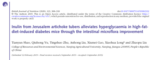 ❷ 肠道菌群在肥胖,胰岛素抵抗和2型糖尿病的炎症和代谢紊乱的发展中起着重要作用。肠道菌群被认为是治疗2型糖尿病和预防其他微观和宏观血管疾病的规定指标。肠道菌群可能与脂多糖的产生和代谢性内毒素血症有关。益生菌可以在糖尿病和肥胖受试者中恢复黏蛋白阿克尔曼氏菌的肠道菌群。菊粉可引起肠道双歧杆菌发生变化和拟杆菌属以及降低厚壁菌门的丰度。❸ 菊芋是多年生块茎植物。它的块茎主要由碳水化合物制成,主要是菊粉形式。菊粉是可溶性纤维,并且包含果糖分子的短链,如β- 2,1果聚糖。菌素(STZ)是一种有毒的亚硝基脲类似物,它可以选择性地破坏特定胰腺β经由GLUT2细胞在小鼠和大鼠。STZ可以抑制胰腺β细胞的功能并减少胰岛素的分泌。因此,它经常被用来建立糖尿病的动物模型。小剂量STZ可能会轻微损害胰腺β功能细胞并可以适度减少胰岛素分泌,产生类似于2型糖尿病患者胰岛素分泌不足的症状。❹ 本研究通过连续1个月饲喂高脂饮食(HFD)和1周多次低剂量(50 mg / kg)STZ来诱导高脂血症-糖尿病小鼠的可重复实验模型。考虑到菊芋菊粉对健康的潜在益处,本试验旨在研究其对空腹血糖(FBG)稳态,平均每日食物消耗,体重,平均每日水消耗,相对肝脏重量,血脂水平,肝脏相关基因的影响高脂血症-糖尿病小鼠中的表达和肠道菌群。❺ 菊芋菊糖以剂量依赖性方式降低FBG和血脂水平,并在喂食HFD的小鼠和STZ治疗的小鼠中表现出降血糖作用。菊粉的治疗后,高血糖小鼠的肝脏相关基因表达改变,高血糖小鼠的肠道拟杆菌的比例显著上升。菊芋菊粉可以缓解糖尿病,并增加由HFD喂养的高血糖小鼠和STZ治疗的高血糖小鼠的有益肠道菌群。菊芋菊粉可用作预防和/或治疗高血糖症的功能性食品成分。