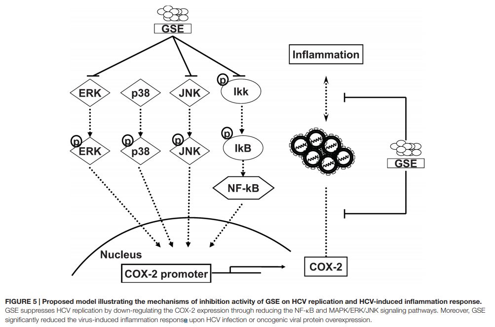 体外细胞实验结果表明,GSE处理表现出显著的抗丙型肝炎病毒(HCV)活性,并抑制了由HCV升高引起的环氧合酶2(COX-2)的表达来抑制HCV复制,这与这与IKK调节的NF-κB和MAPK / ERK/ JNK信号通路的失活有关。此外,GSE还减弱了HCV诱导的炎症细胞因子基因表达。