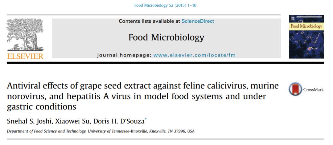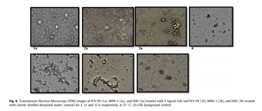研究了葡萄籽提取物(GSE)在室温和37℃下24h内对猫杯状病毒(FCV-F9),鼠诺如病毒(MNV-1)和甲型肝炎病毒(HAV)时间和计量依赖性抑制作用;以及37℃食物模型(苹果汁和2%的牛奶)和模拟肠胃道环境下GSE对病毒的影响。结果表GSE对病毒的抑制效果随时间和浓度的增加而增加;在模拟肠胃液的环境中,2 mg/ml的GSE在6小时后将FCV-F9、MNV-1和HAV降低到未检出的水平。
