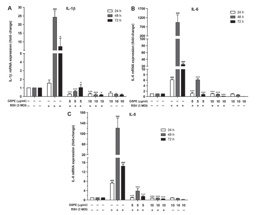 用GSPE预处理气道上皮细胞A549,观察GSPE在呼吸道合胞体病毒(RSV)感染过程中对细胞因子产生的影响。A549细胞经RSV感染,加或不加GSPE预处理,培养24h、48h、72h,检测白介素(IL)1β,IL 6和IL 8的表达。结果表明RSV感染引起促炎细胞因子的表达显著增加。但是,GSPE预处理后降低了IL-1ß,IL-6和IL-8的表达水平。GSPE通过减少RSV诱导的气道上皮细胞中促炎细胞因子的转录来调节免疫反应,这表明GSPE有助于预防RSV诱导的气道疾病。