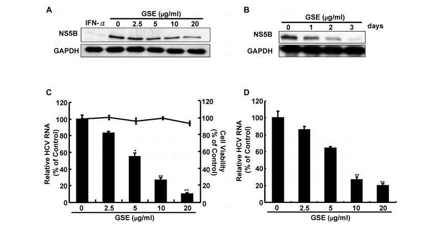 图:葡萄籽提取物(GSE)抑制丙肝病毒(HCV)蛋白合成和RNA复制