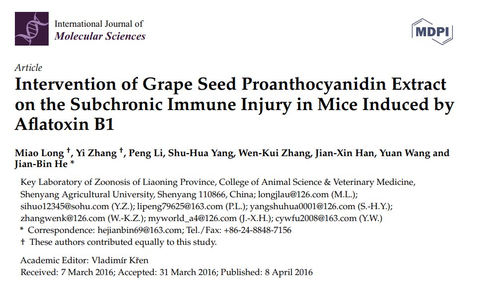 3、葡萄籽原花青素提取物对黄曲霉毒素B1所致小鼠亚慢性免疫损伤的干预作用