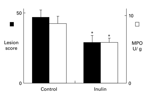 图2. DDS诱导的大鼠结肠炎结肠黏膜病变评分(实心柱,左y轴)和组织中髓过氧化物酶(MPO,开放柱,右y轴)含量。每日经口灌胃给予400毫克菊糖可显著降低结肠组织的病变评分和髓过氧化物酶含量(见参考文献28)。