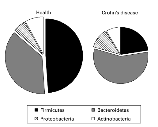 图1. 克罗恩病患者的粪便微生物群中含有的硬壁菌比例降低。该图显示了来自Manichanh及其同事(参考文献18)的数据,并代表了6名健康人和6名临床病情缓解患者的每个部门的系统类型数。